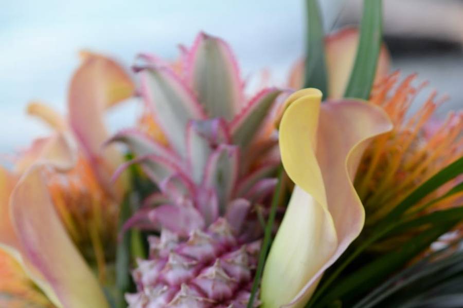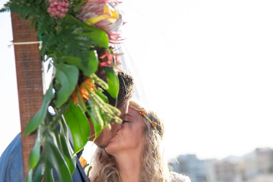 Ich wurde mit dem Hotelcart zum Palmenplatz geführt, das letzte Stück gingen wir zu Fuß über die Brücke. Tom wartete schon beim wundervoll geschmückten Blumenbogen auf mich. Die Location war wunderschön, Sessel mit Blumenstecker, ein Obst und Getränketisch, und eben der schöne Blumenbogen.