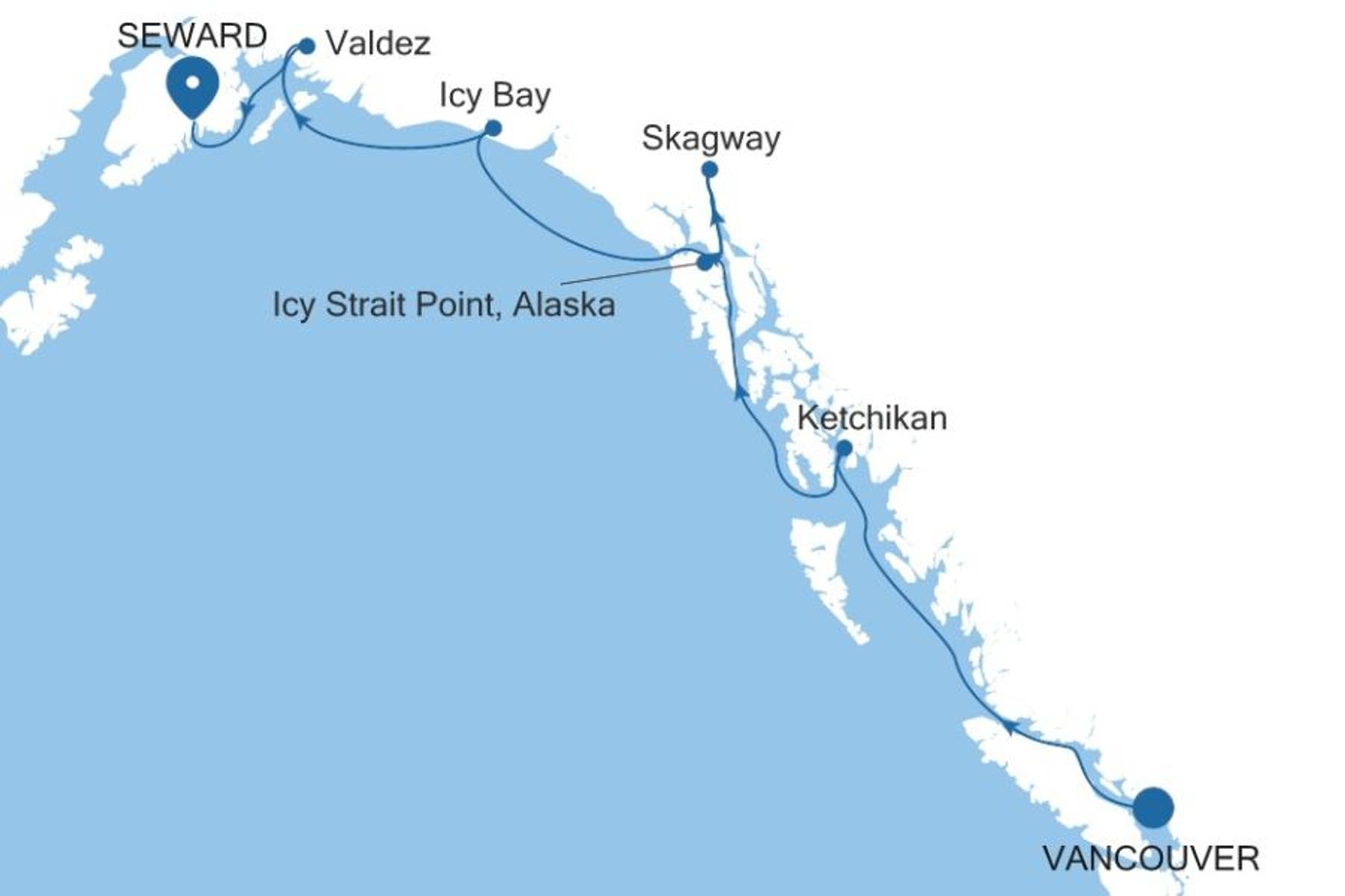 Ab Vancouver führt Sie diese Kreuzfahrt durch die atemberaubende Inside Passage in die ungezähmte Wildnis Alaskas. Erleben Sie kalbende Gletscher, halten Sie Ausschau nach Walen, Bären und majestätischen Weißkopfseeadlern und entdecken Sie charmante Küstenorte wie Ketchikan, Skagway und Valdez. In Icy Strait Point und Icy Bay erwarten Sie unvergessliche Naturerlebnisse, bevor die Reise in Seward bei Anchorage endet.
