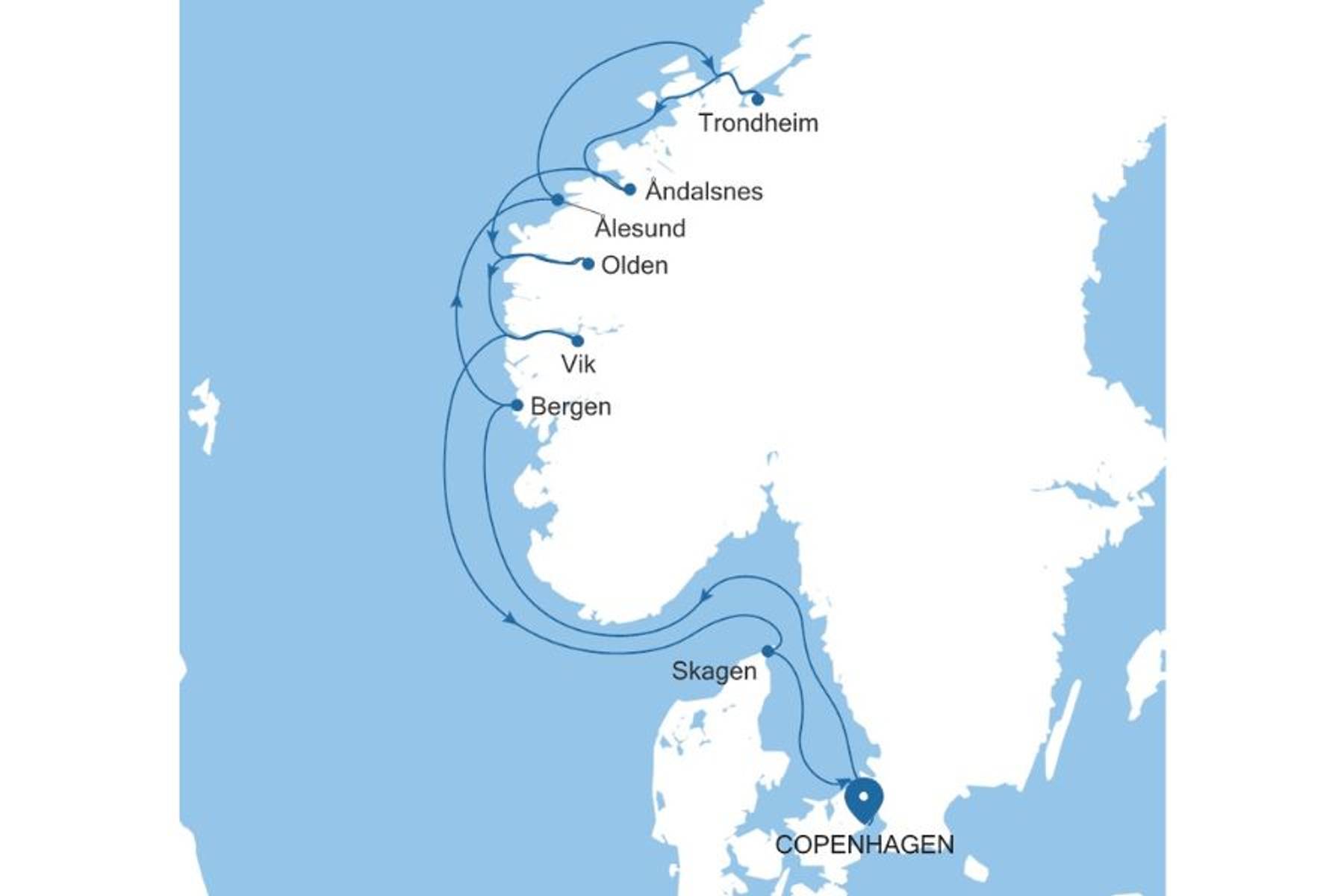 Ab Kopenhagen starten Sie zu einer Kreuzfahrt voller Naturwunder und nordischem Flair. In Bergen, dem „Tor zu den Fjorden“, beginnt Ihre Reise durch spektakuläre Landschaften. Freuen Sie sich auf die Jugendstilstadt Ålesund, das historische Trondheim und die malerischen Orte Åndalsnes, Olden und Vik – eingebettet in die atemberaubende Fjordwelt. Zum Abschluss erwarten Sie Skagen und die entspannte Atmosphäre Kopenhagens.